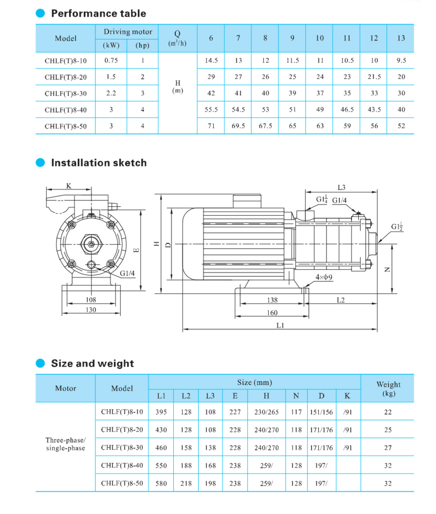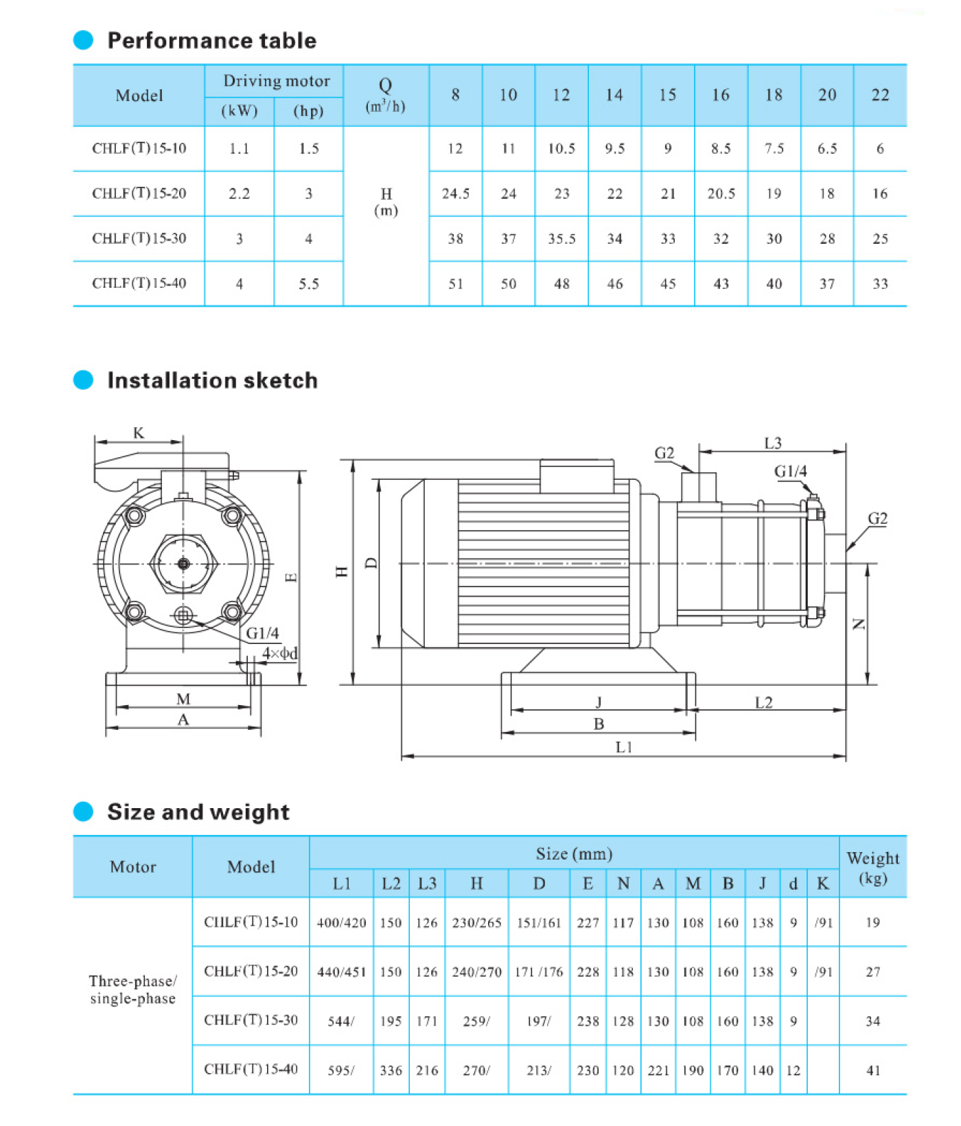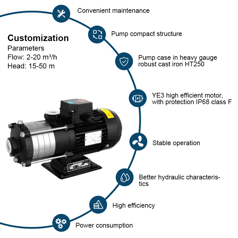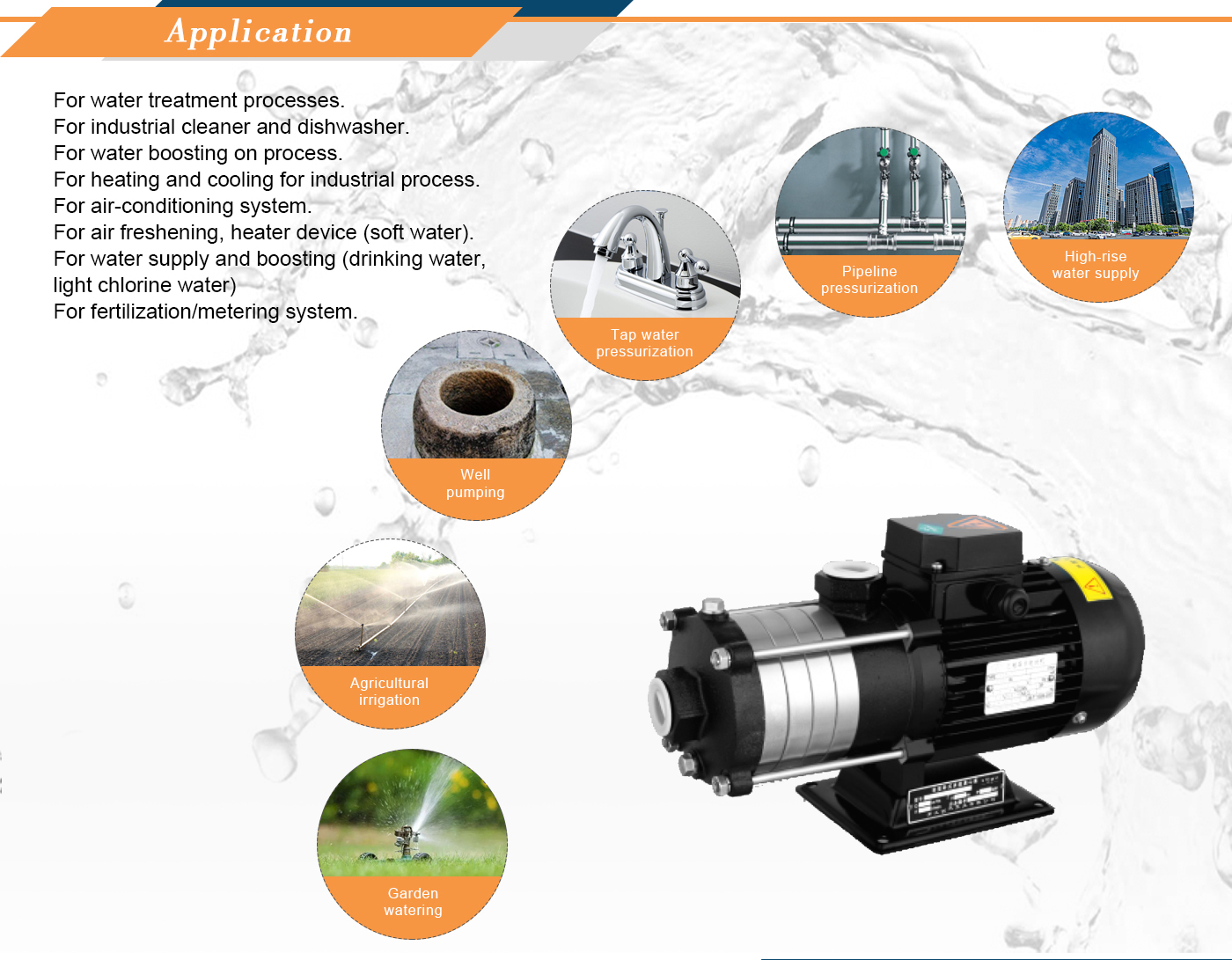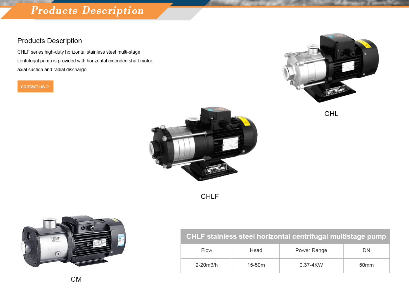 Series CHLF summus officiorum horizontalium ferro incorrupto multi scaena centrifugae sentiae instructus est cum hastili motore horizontali extenso, axiali suctu et missioni radiali.