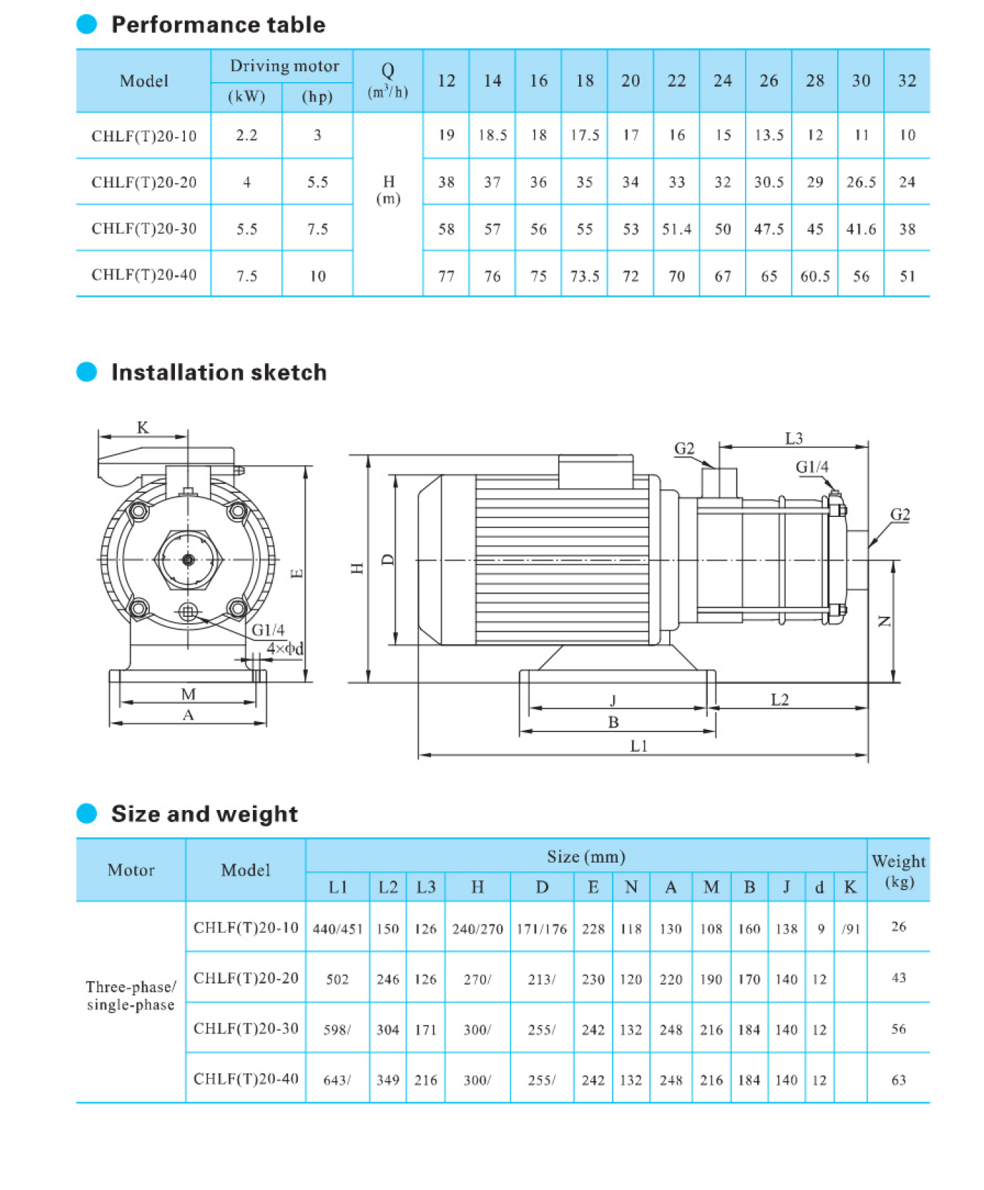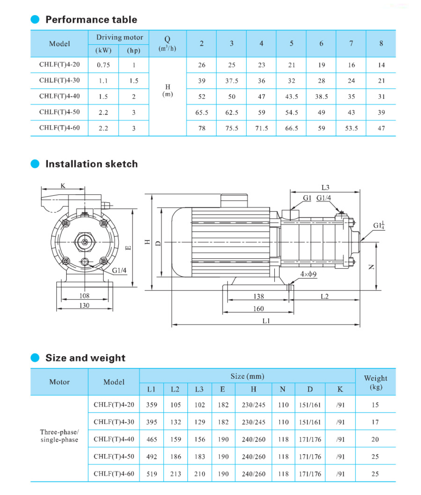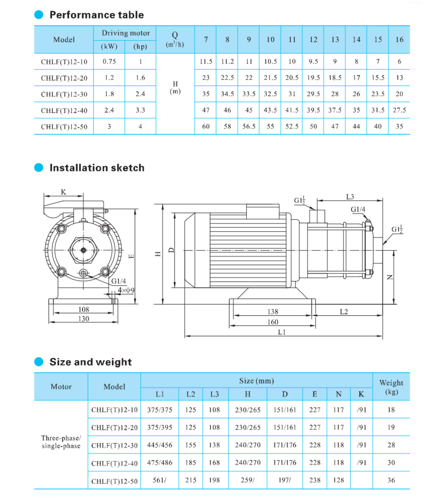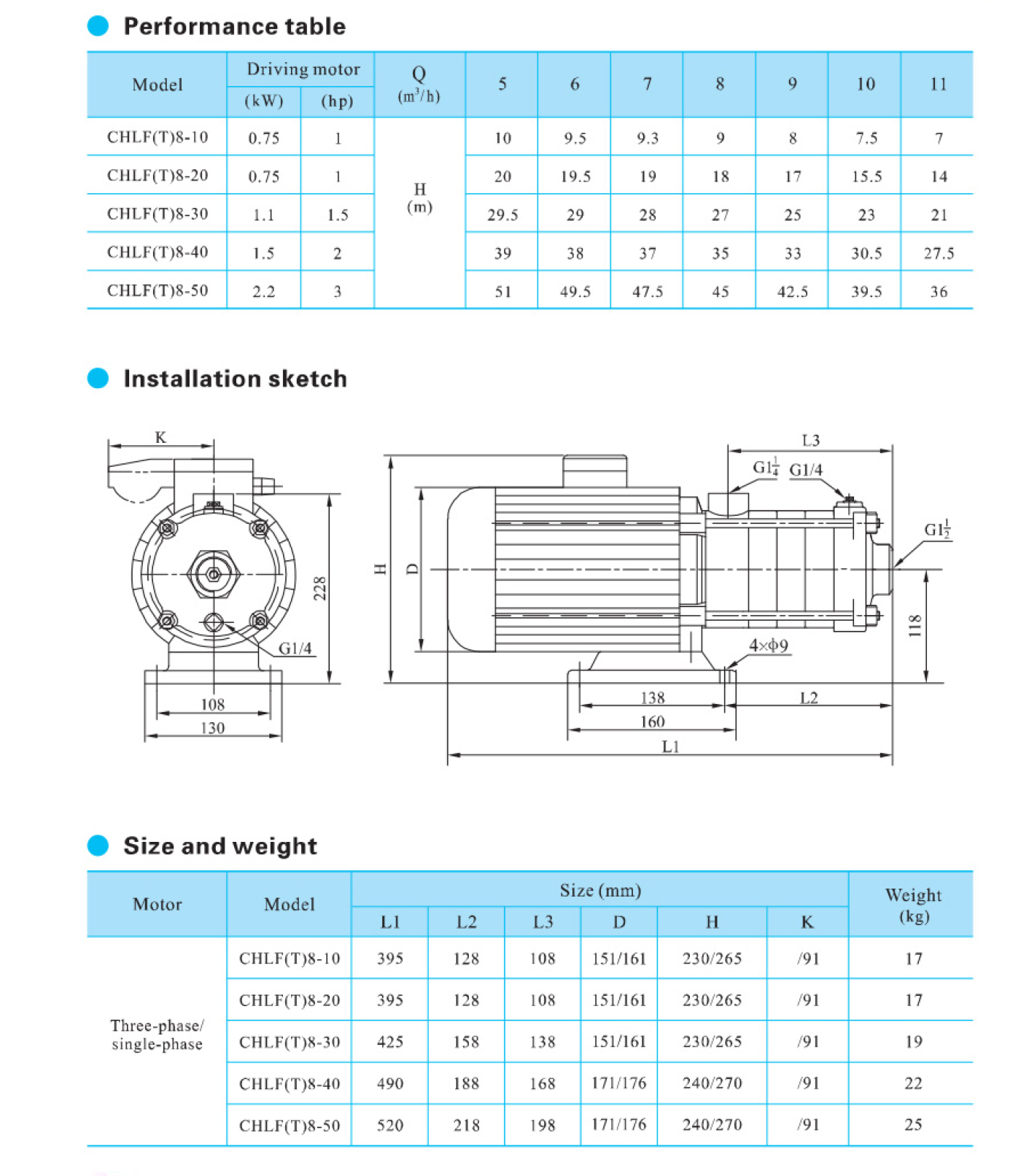 Series CHLF summus officiorum horizontalium ferro incorrupto multi scaena centrifugae sentiae instructus est cum hastili motore horizontali extenso, axiali suctu et missioni radiali.